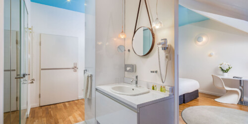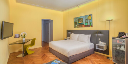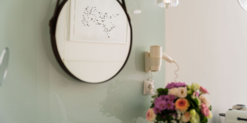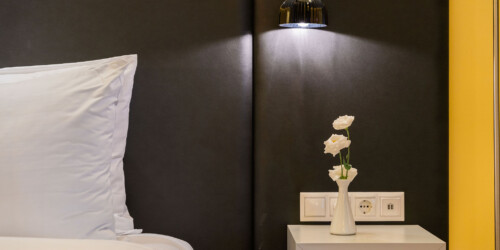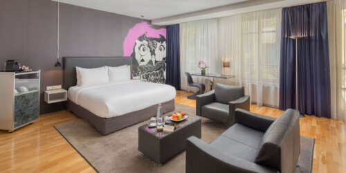 A minimál-stílusú, kortárs magyar művészek alkotásival díszített szobák légies, világos hangulata az ezüst és fehér szín finom kombinációjának köszönhető.